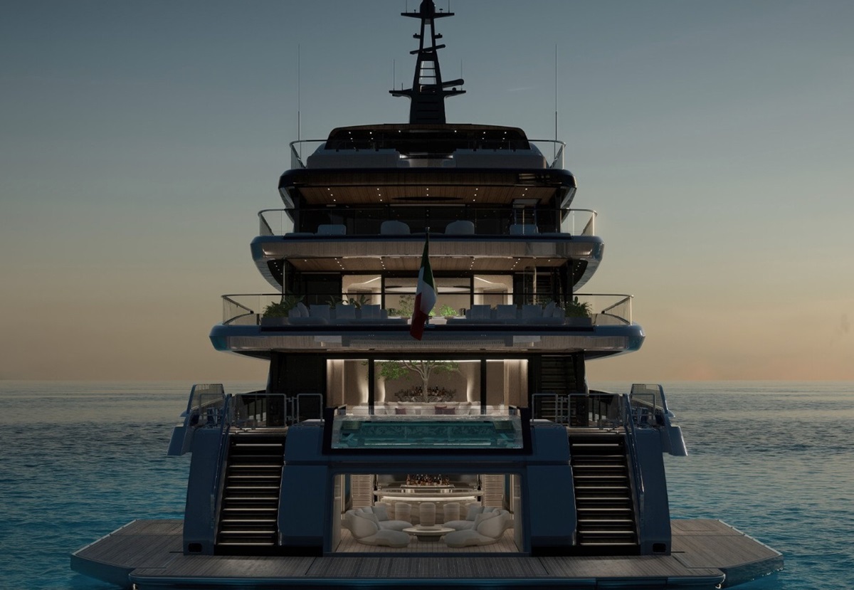 Questo beach club è stato riprogettato ed è più grande del 40% rispetto a quello del primo 74 Steel consegnato nel 2025. Inoltre, su questo ponte è stata installata una piscina con fondo in vetro che funge da lucernario di 28 metri quadrati per illuminare il ponte inferiore. Il ponte principale a tripla altezza dispone di una cantina a vista e di una scala a chiocciola in alluminio laccato scuro, oltre che di un ascensore. A prua dell’imbarcazione si trovano un eliporto e il ponte sportivo.