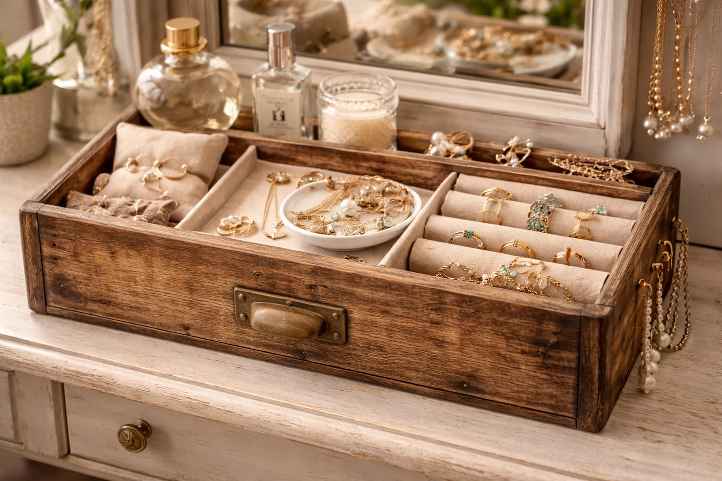 Un altro uso pratico da dare ai cassetti di legno è quello di portaoggetti. Realizzando delle divisioni interne, saranno ideali per conservare gioielli, anelli, catenine e bigiotteria.